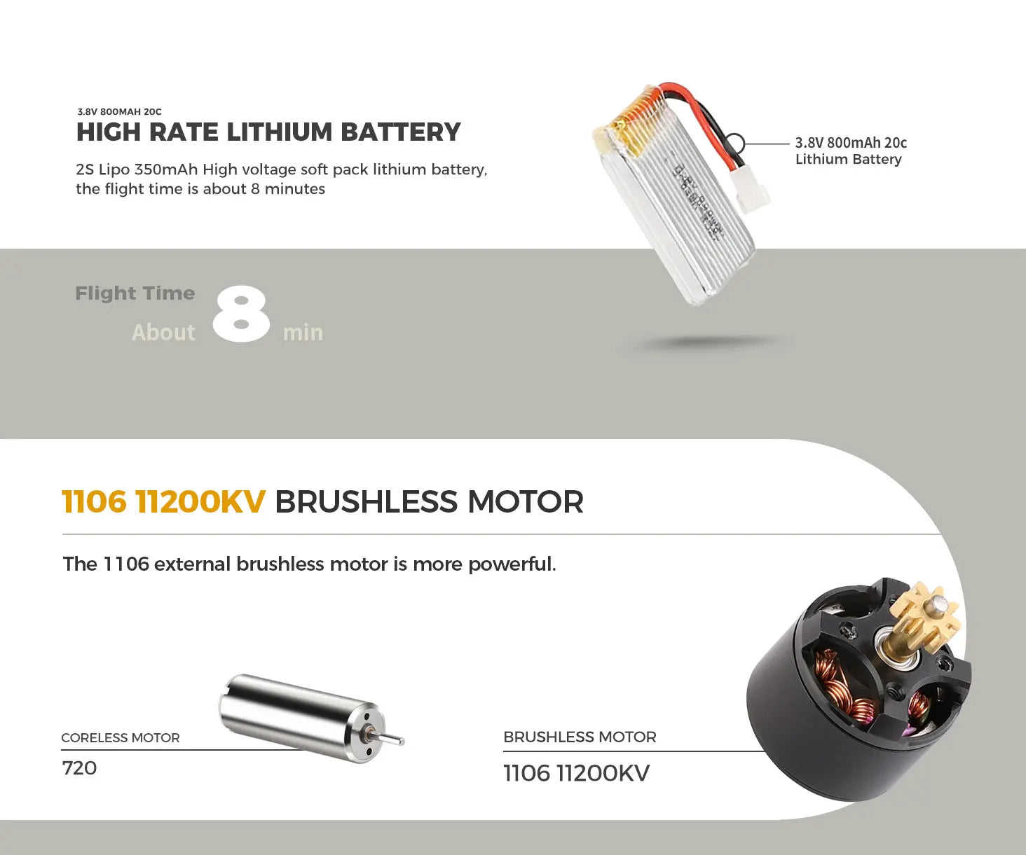 Comes with a 3.7V 800mAh 20C Li-ion battery, providing up to 8 minutes of continuous flight per charge. Includes a USB smart charger for convenient, safe, and fast recharging.